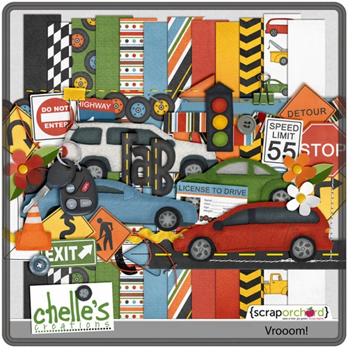 The title to the kit says it all Vrooom! Chelle’s Creations kit is perfect for that little speedster in your life. I love the colors, so bright and bold. Notice the word art at the bottom-instant titles for your page-too easy.