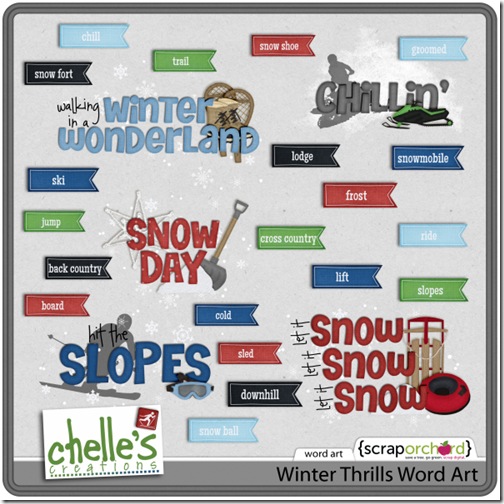 Winter Thrills bundle by Chelle's Creations. Winter + Outdoors = FUN! Do you love getting outdoors in the winter? Skiing...snowmobiling...sledding...snowshoeing...or just digging out from the most recent storm. Winter Thrills Bundle by Chelle's Creations has everything you need to scrap those chilly thrills.